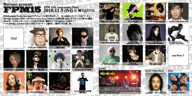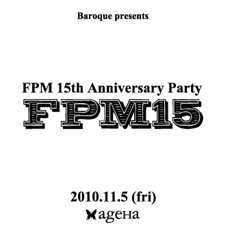 FPM(Fantastic Plastic Machine)のデビュー15周年を記念して、史上最高にゴージャスなパーティ「Baroque presents FPM 15th Anniversary Party『FPM15』」が新木場ageHa全フロアにて盛大に開催!2010年、これ以上ないと言っても過言ではない豪華メンツがageHaに大集合!!! いつも何が起こるかわからないFPMのパーティ! 絶対に、絶対にお見逃し無く!!! Baroque presents FPM 15th Anniversary Party 『FPM15』 【会場】 新木場ageHa ARENA、WATER、ISLAND、BOX同時開催 東京都江東区新木場2-2-10 03-5534-2525 http://www.ageh