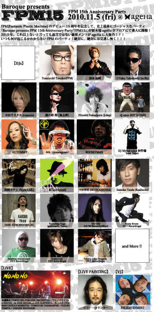 ※管理人様、告知失礼致します。 リリー・フランキーさんがライブペインティングで出演して下さいます! リリーさん直筆のイラストが手に入るかも!? 是非、遊びに来てください! FPM(Fantastic Plastic Machine)のデビュー15周年を記念して、史上最高にゴージャスなパーティ「Baroque presents FPM 15th Anniversary Party『FPM15』」が新木場ageHa全フロアにて盛大に開催!2010年、これ以上ないと言っても過言ではない豪華メンツがageHaに大集合!!! いつも何が起こるかわからないFPMのパーティ! 絶対に、絶対にお見逃し無く!!!
