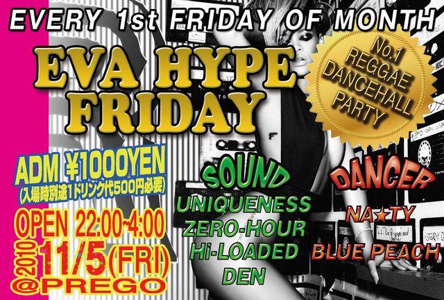 告知失礼します。 ■毎月第1金曜日! EVA HYPE FRIDAY (エバ ハイプ フライデー) 「誰もが自由に遊べて楽しめるダンスホール」 をテーマに 和歌山 プレゴにて大好評開催中!!! ■レゲエの現場で流行中のダンスホールから 80年代、90年代のクラシック ミディアムの名曲など 「レゲエ」を中心に HIP-HOPやR&Bもお届けするので 幅広く楽しめるREGGAE DANCEHALL PARTY ■始めの時間はオールディーズや ファンデーションはもちろん R&Bにラバーズやカバーズが流れるので オシャレなクラブで ゆっくり