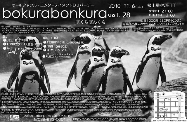 「ボクラボンクラ」vol.28 GUEST DJ *TERAMACHI(LONDON金庫) *MANI(HB303) *モヤトリアム DJ *みやちゃん(NN~DURA) *LELID MASA(NOW) *TOMO☆CAT(星空JETT) イングリッシュティーチャー *ALEX(アメリカ合衆国) ADV/DOOR 1000YEN(1D付) ※先着30名様にはみやちゃんセレクトCDをプレゼント! やってきましたオールジャンル・エンターテイメントDJパーティーボクラボンクラ秋の定演! 肌寒くなっておセンチになっちゃったそこのアナタもあなたもキミも君も!サタデーナイトにジェットに来てお酒で音楽でダンスで暖をとったらイイ