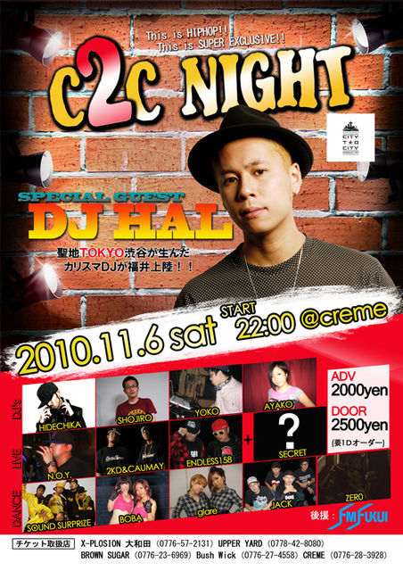 「10年にのひとりの逸材」との呼び声高いスキルとセンスの持ち主。 「聖地TOKYO渋谷が生んだカリスマ」DJ HALが待望の福井初登場! 地元福井からも、週末の夜を熱くさせているアーティストが勢ぞろいするということでスペシャルな化学反応が起こること必至! ブラックミュージック好きはマストチェック!! 【more info】 http://ameblo.jp/citytocity ▼詳細▼ CITY TO CITYpresents 「C2C Night!」 2010年11月6日(sat)22:00〜 @CREME 福井県福井市順化1-2-12メトロ会館2F info:TEL 0776-28-3928 http://www.cre
