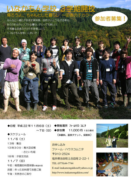11月に開催する田舎暮らし体験イベントをご案内します。 福井県池田町!! 中山間地に位置し、里山風景が広がる素敵な場所です。 現地のおんちゃん、おばちゃん達と収穫体験や郷土料理づくり、きのこ採りなどを予定しています。 近くの温泉にも入れますよ。 ================================================ いなかもん学校 <3学期>開校! 帰ろうよう、ちゃんとした暮らし〜田舎のチカラ〜 みんなと一緒に汗を流す爽快感、自然や人とつながる幸せ。 あたりまえのシンプルな暮らしがとっても楽しい。 不思議な田舎のチカラ
