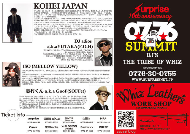 Surprise 10th Anniversary presents [ TRACKER ] -GUEST LIVE- KOHEI JAPAN -LIVE- SPECIAL SECRET -DJ- ISO (MELLOW YELOWW) DJ adios a.k.a YUTAKA(F.O.H) 志村くん a.k.a GooF(SOFFet) YOOICHI (SWING CHOP) -SUPPORT DJ- DJ MATZ(FM FUKUI) DJ HIRO -PHOTO- honeycame[yuta shirakawa] Casa(B1F) Supported by Cacasi(http://cacasi05.blog34.fc2.com/) [0776SUMMIT]&[Whiz Leathers WORK SHOP] -DJ's- THE TRIBE OF WHIZ leathercustum&maintenance +goods shop Sala(2&3F) Produce