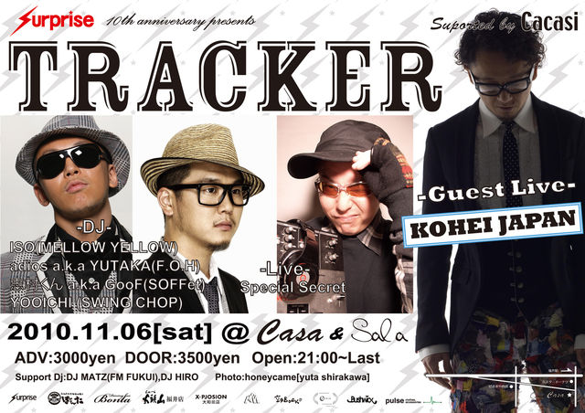 Surprise 10th Anniversary presents [ TRACKER ] -GUEST LIVE- KOHEI JAPAN -LIVE- SPECIAL SECRET -DJ- ISO (MELLOW YELOWW) DJ adios a.k.a YUTAKA(F.O.H) 志村くん a.k.a GooF(SOFFet) YOOICHI (SWING CHOP) -SUPPORT DJ- DJ MATZ(FM FUKUI) DJ HIRO -PHOTO- honeycame[yuta shirakawa] Casa(B1F) Supported by Cacasi(http://cacasi05.blog34.fc2.com/) [0776SUMMIT]&[Whiz Leathers WORK SHOP] -DJ's- THE TRIBE OF WHIZ leathercustum&maintenance +goods shop Sala(2&3F) Produce