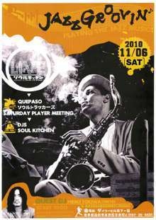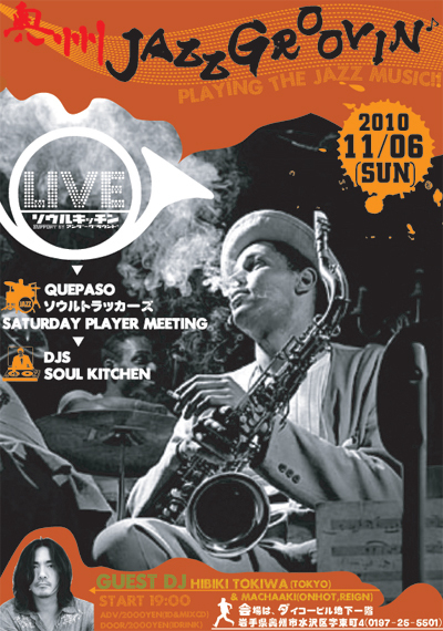 奥州JAZZ GROOVIN' 11/6(SUN) 19:00〜 水沢ダイコービル地下一階 SPECIAL GUEST DJ 常盤 響@東京 LIVE GUEST ソウルトラッカーズ@奥州 QUEPASOQUEPASO Saturday Player Meeting@盛岡 飛び入りLIVE ガンボーチローズのアラヤ氏 龍伝の龍大氏 GUEST DJ MACHAAKI (ONHOT.REIGN)@遠野 DJs ソウルキッチン 前売り 2000yen(1d+mixCD先着20名) 当日 2000yen