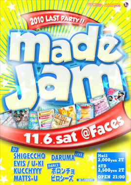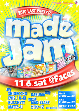 11月6日(SAT)@FACES MADE JAM 21:00〜LAST MAIL 2000(2D) ATD 2500(2D) DJ's SHIGECCHO EVIS U-KI KUCCHYYY MATTS-U MC DARUMA DANCER ボロンチョ(秋田) ピロシーズ ハイ! 奇数月開催のMADE JAM! いよいよ、今年最後のLAST PARTYになります そして、9月に無事に2周年を迎える事が出来ました MADE JAMに参戦してくれた、DJ&MC&DANCERの皆様! そして、遊びに来てくれた皆様には感謝しておりますm(__)m 本当に有難うございます