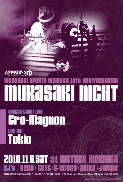 2010.11.6 SAT/////ムラサキスポーツ10周年記念【MURASAKI NIGHT】 @ Mother morioka OPEN 21:00〜3:00 ENTRANCE @\3000-(1D)150LIMITED!!!!!! 前売チケットはありません。先着で150名入場で制限させて頂きます。 SPCIAL GUEST LIVE 【cro-magnon】 http://www.myspace.com/cromagnonmusic LIVE ART 【TOKIO】 http://www.myspace.com/tokiotokio DJ’s UENO (ICI SPORT/alealea) CUTS (FLAT 4/IWAWAKI FM) G-HONKY (FLAT 4) JUMBO AKIRA (MURASAKI SPORT/alealea) FLYER/JAZZRIZE Special Feat 【松井克師】