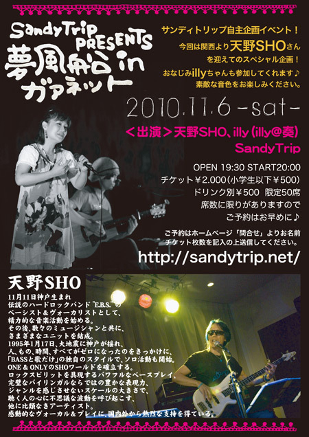 ● 出演:天野SHOさん、illy (illy@奏) from 関西、SandyTrip ● 場所:佐世保ガァネット ● 時間:OPEN 19:30/START 20:00 ● チケット¥2,000(小学生以下¥500)+ドリンク別¥500 ※限定50席 チケット予約はSandyTripホームページカテゴリー"お問い合わせ http://sandytrip.net/mail/ "より 11/6夢風船 in ガァネットチケット予約希望と題し、お名前とチケット予約枚数をお知らせ下さい。チケットに限りがありますので、ご希望の方はお早めのご予約よろしくお願いします。 その他お問い合わせ:佐世保ガァネット 〒857-0806 長崎