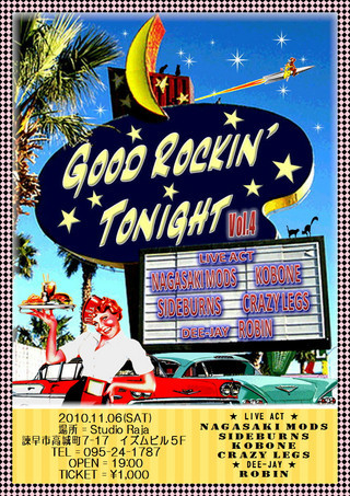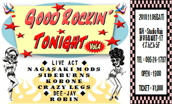 Good Rockin' Tonight Vol.4 2010年11月06日(土) 場所 = Studio Raja 諫早市高城町7-17 イズムビル 5F TEL = 0957-24-1787 OPEN = 19:00 START = 19:30 TICKET = \1,000 ◆ LIVE ACT ◆ ♪ 長崎モッズ ♪ SIDEBURNS ♪ 小骨 ♪ CRAZY LEGS ◇ DEE-JAY ◇ ♪ ROBIN ♪ ばんび C'mon Everybody ! 必ず皆さん楽しめる! RockabillyRock n Rollイベントです。