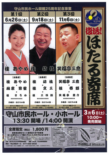 8年ぶり復活!ほたる寄席 出演者: 笑福亭三喬 桂春蝶 笑福亭喬介 なにわの会 (お囃子) お問い合わせ 守山市民ホール:077-583-2532 チケット 1回公演分:¥1800 3回セット:¥3600 各回先着300人。