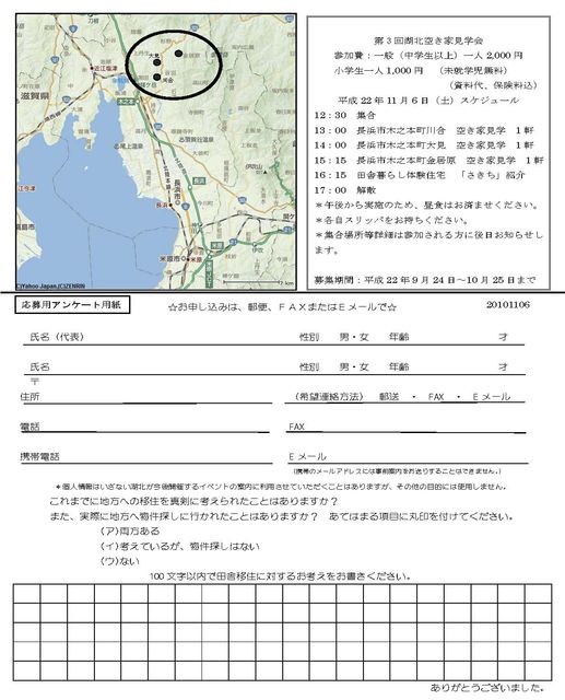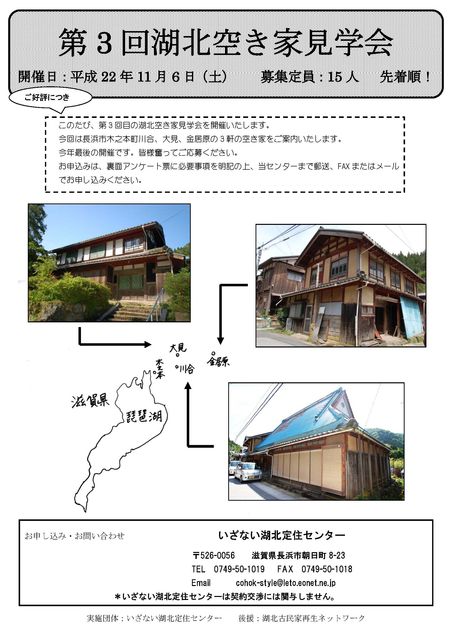 管理人様イベントの告知をさせていただきます。 皆様こんにちは。 このたび11月6日(土)に第3回目の湖北空き家見学会を開催します 過去2回の開催ではご好評をいただいており、 今回は今年最後の開催です 詳しくは→http://cohokstyle.shiga-saku.net/e506330.html 皆様のご応募お待ちしております