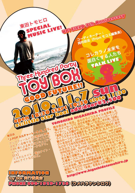 キモチのイイ イベントします! キモチのイイ音楽に乗せて☆ Good Future !!! 良き未来を夢見て。 ● 11月7日(日)@長崎書店3Fリトルスターホール 19:30〜 「東田トモヒロLIVE」×「熊本を騒がせてる人たちのトークLive」を 企画しています!!! 東田さんは、熊本出身のメジャーシンガーで フジロックはじめ、apbankフェス、、etc、数万人規模のフェスで大活躍しつつ 唯一無二のスタイルで全国に多くのファンを持つメッチャかっこいい 僕のゲキオシ☆アーティストです。 トークLIVEには、「月