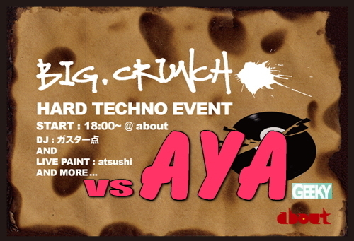 日付:11月7日(日) Party名:BIG CRUNCH start時間:18:00〜23:00 料金:free(入場料無料) ジャンル:HARDTECHNO DJs:ガスター点 / AYA LIVE PAINT:atsushi タイムテーブル: 18:00〜20:00 AYA 20:00〜23:00 ガスター点 9月よりここaboutにて、再スタートしたBIG CRUNCH(ビッグクランチ)!!!! 前回は沢山のお客さんが遊びに来てくれましたよ!! 本当に感謝です!! そしてまた今回も普段あまり馴染みの無いHARDTECHNOを堪能しに来てくださぁ〜い。 もちろんチャージフリーで開催します!