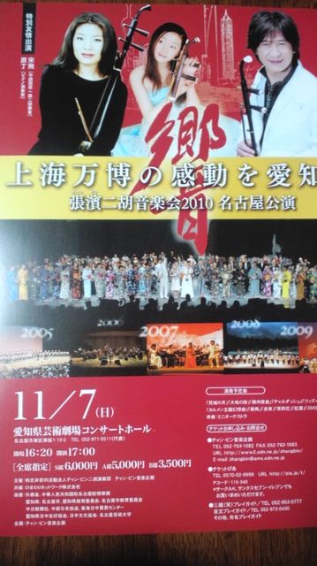 上海万博の感動を愛知へ 張濱二胡音楽会2010 名古屋公演 愛知県芸術劇場コンサートホールにて開催 開場16:20 開演17:00 〔全席指定〕S 6000円 ・A 5000円 ・B 3500円 詳細は ”二胡のチャンビンです” http://ameblo.jp/zhangbin/