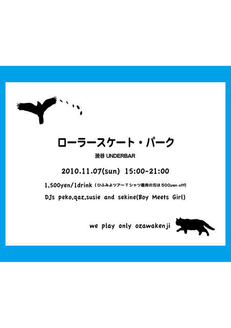 ローラースケート・パーク開催のお知らせ 小沢健二の公式音源発表曲(カラオケ除く。多分。)を全曲かけるイベントを開催します。6時間ずっと小沢健二。ひふみよセットリストもひふみよで聴けなかったあの曲も。全曲かけます。 爆音でかかり続ける小沢健二を聴きたい方、 思い出すたびなにか胸につっかえてるだけの方、 樹も動くかも〜の方、 パーッと華やぐ溢れる光・公園通りにてローラースケートで走って回りましょう。 『ローラースケート・パーク』 2010年11月7日(日曜日) 15:00-21:00 渋谷UNDERBAR(溢れる光 公園通り)