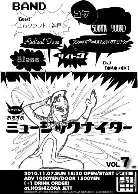 お久しぶりちゃんにやっちゃいませそ! 今回は神戸からエムクラフトさんをゲストにポップにポッピングに開催します〜♪♪♪ 7回目なだけにウル●ラセブンにしてみました。w 2010.11.07.SUN 「TOMO☆CATのおすすめミュージックナイター」vol.7 GUEST *エムクラフト(神戸) BANDS *Radical Face *Bless *スーパーサイクロン *South Bound *ユケ *サイド3 DJ *TOMO☆CAT 18:30 OPEN/START ADV 1000YEN/DOOR 1500YEN (+1DRINK ORDER)