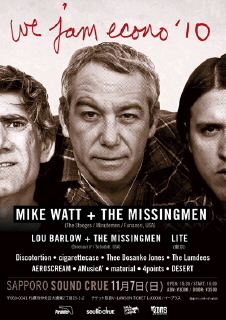 これはマイク・ワット主催のイベントの札幌版です!出演バンドもかなり豪華です! We Jam Econo '10 11/7(sun) 札幌SOUND CRUE(札幌市中央区大通東2丁目15-1-2 open 15:30 start 16:00 price \3000(\3500) without drink(\500) LAWSON TICKET L-13786(発売中) Mike Watt & The Missingmen Lou Barlow & The Missingmen LITE Discotortion シガレットケース The Lumdees AEROSCREAM AMusicA' material 4points DESERT http://wejamecono.jp/ 前日はスピリチュアルラウンジでマイク、ルー、LITEのお三方出演します http://spirituallounge.jp
