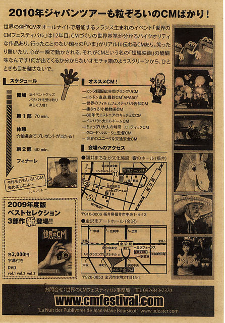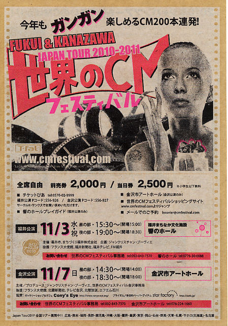北陸地方のみなさ〜ん!今年もこの季節がやってまいりました! 世界のCMフェスティバル in KANAZAWAを開催します! 今年も世界中から傑作CMを200本とりそろえました! 今年の音楽ゲストは大吹奏楽団! さらに、毎年恒例抽選会では今年はCony'sEyeさんからのプレゼントも! ぜひ、今年も遊びに来てくださいね! 日時:11/7(日) 昼の部14:00開場 14:30開演 夜の部 18:00開演 18:30開場 場所:金沢市アートホール(金沢駅前です!) (※ 去年までの金沢市民芸術村ではないのでご注意ください) チケット:前売 \2,000 当日 \2,500