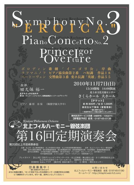 ■曲目 歌劇「イーゴリ公」序曲(A.ボロディン) ピアノ協奏曲第2番ハ短調 Op18(S.ラフマニノフ) ソリスト・・・藤原 奈保(桐朋学園大学卒) 交響曲第3番「英雄」Op55(L.V.ベートーベン) ■指揮:田久保 裕一 ■管弦楽:北上フィルハーモニー管弦楽団 ■チケットは、各プレイガイドまたは団員からお求めください。 前売 ¥800 / 当日 ¥1,000 高校生以下無料(要整理券) ・ご来場をお待ちしております・・・。 プレイガイド 【北上市】 江釣子ショッピングセン
