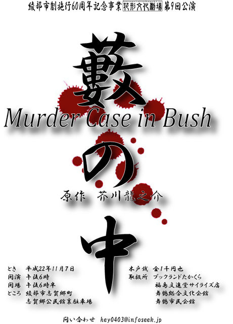 綾部を中心に活動する花形文化劇場が芥川龍之介原作の藪の中を原作にした芝居を野外公演します。