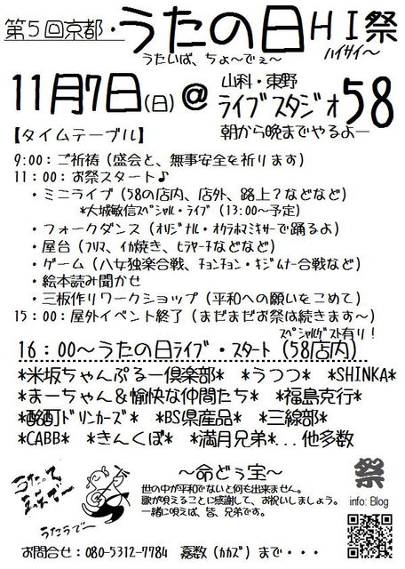 58の外では、ミニライブや、フォークダンス(オリジナル・オクラホマミキサー)、屋台(フリマ、ヒラヤーチなどなど)、ゲーム(八女独楽合戦、チョンチョン・キジムナー合戦など優勝者にはトロフィー授与!)、絵本読み