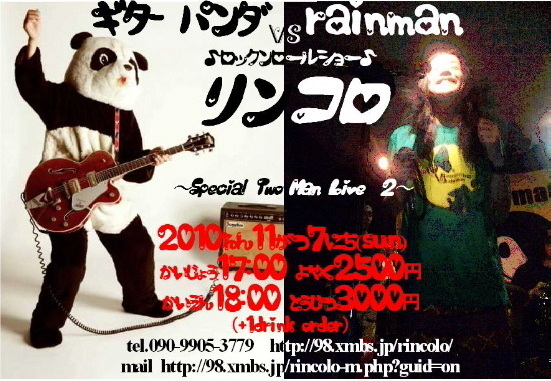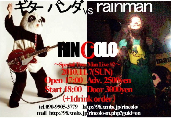 ☆11月7日(日) 《Guitar Panda vs rainman》 〜Special Two-Man Live #2〜 開場 17:00 開演 18:00 adv. \2500 door \3000 (+1drink order) ギターパンダこと山川のりをさんと、のりをさんをリスペクトするrainmanのスペシャル2マンライブ! いよいよ渾身のニューアルバム『monsoon jam』が全国発売され、今後の展開がますます楽しみになってきたrainmanの明日を占う今年の最重要ライブになることは間違いない! とにかく観てほしい!! ☆RINCOLOコミュ http://m.mixi.jp/view_community.pl?id=3475838& ☆RI
