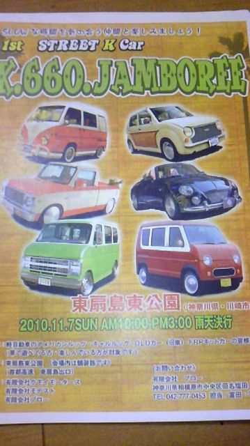 アメリカン キャル OLD FRPキットカー の軽自動車イベント(一部例外もありますのでご相談ください)です関東では初のイベントになると思います 日頃 集まれない軽自動車のお祭りです 当日はコンテストありジャンケン大会ありビンゴ大会ありだそうです 雑誌の撮影も来るそうです 参加費用3000円/台 見学は無料ですが駐車場代などはかかります 事前エントリー100台参加申込み方法は現金書留に3000円と住所 名前 連絡先 ナンバー 車種を記入したものと参加車両の写真を同封して K.660.JAMBOREE事務局に送ってください 写真審査の結果ジ