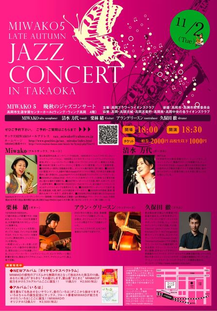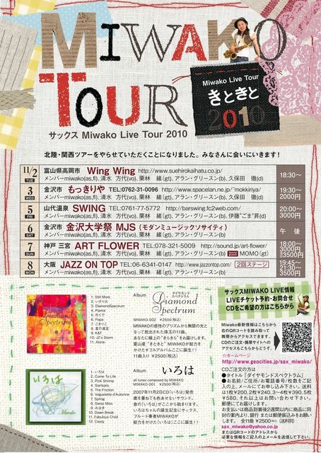 11月は私の出身の富山県高岡市でコンサートをします その後、金沢、山代温泉、神戸、大阪と行きます ぜひみなさまお会いしましょう ■MIWAKO TOUR きときと2010 ♪東京都 東中野 日時: 10月24日(日) ( 開演14:00) 出演: miwako(alto saxophone、flute) 松木理三郎(trumpet) 栗林緒(guitar) アラングリースン(contrabass) 久保田徹(drums) 中島えりな(vocal) 場所:東京テクニカルカレッジ(東中野) HP:http://www.tera-house.ac.jp/index.php 住所:東京都中野区東中野4-2-3 TEL: 03-3360-8881 入場無料 ♪