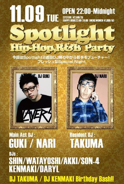 告知失礼します。 11/9(火) 22:00-5:00 -HipHop, R&B Party- 『SPOTLIGHT -So Fresh SP-』 @Camelot 『SPOTLIGHT』とは...? ◆平日火曜にも関わらず毎回400名近くのお客様で盛り上がっているHipHop, R&B Partyです。 ◆ゲストのお客様は、終日男性1000円/1Drink、女性1000円/2Drink、というお得 な価格でご入場出来ます。 ■今回の2週目SPOTLIGHTのMain Act DJは... ●Atom, Lounge Neoを中心に数多くのイベントで活躍している、勢いのあるDJ GUKI!! ●渋谷や六本木だけでなく都内各地のPartyに出演中、経験に裏付け