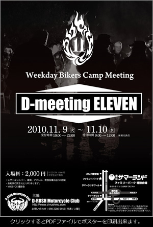 下記のキャンプイベントに参加します 【D-meeting11th】 日時:11月 9日(火)10:00〜22:00(キャンプ) 10日(水) 9:00〜12:00 場所:東京サマーランド ファミリーパーク特設会場 入場料:2,000円(10日のみの場合は1,000円、中学生以下無料) 種別:中距離、夜・昼、キャンプ ■VIBES FOX撮影会 ■D-meetingパッチ販売 ■レザー&シルバー、雑貨、アパレル、飲食各種出店(約50店舗) ■LIVE ■マッタリ焚火・・・ [地図]Google Map http://maps.google.co.jp/maps/ms?hl=ja&ie=UTF8&msa=0&msid=111978856518218297