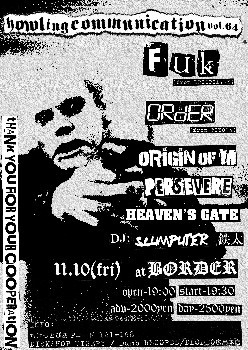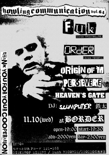 元CHAOS UKのベーシスト、現役のリアルパンクス、ギャバ率いるハードコアパンクバンド「FUK」が4年ぶりにやってくる!! おまけに豊田のリアルパンクス、コウスケ率いる「ORDER」も久々やってくるんだぜ!!! FUKはMISERYで激烈発売中のNEWアルバムをひっさげて(付属のDVDにはHEAVEN'S GATEのマルビリーが出演(笑)、オリジンのにっしん、にっちゃんも写ってます)。 ORDERは久々のNEWシングルEP(タイトル:コンビナート)をひっさげてやって来る!! 対する広島勢!! 怒りを内包した能天気オヤジパンクス、ガイ率いる