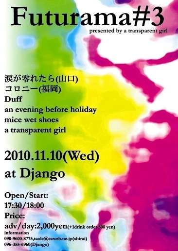 「Futurama#3」 ■11/10(水) ■熊本Django ■出演:涙が零れたら / コロニー / Duff / an evening before holiday / mice wet shoes(ex.klagenicole) / a transparent girl ■open17:30/start18:00 ■前売/当日:¥2,000(要1drink)