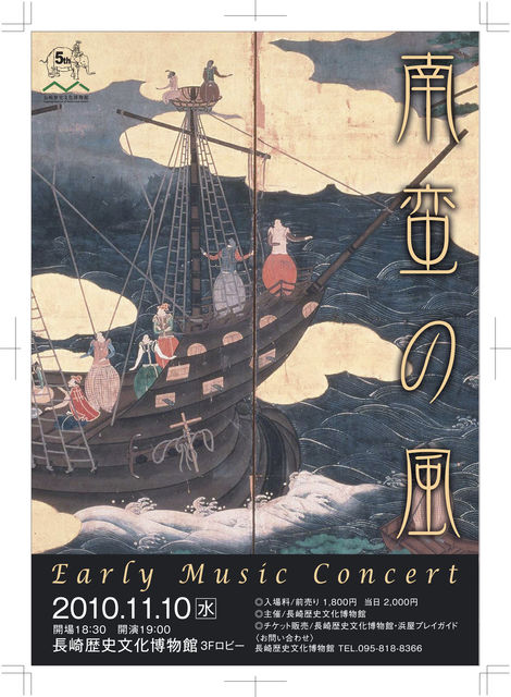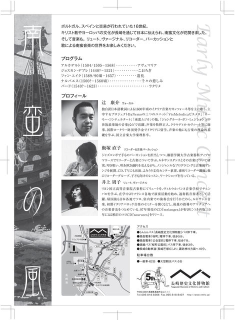 南蛮の風 日時:11月10日(水)19時開演 場所:長崎歴史文化博物館 出演:辻康介(歌)、飯塚直子(リコーダー、パーカッション)、 井上周子(リュート、ヴァージナル) 演目:アルカデルト:白く優しい白鳥 ジョスカン:こおろぎ エイク:道化(リコーダーソロ) ナルバエス:千々の悲しみ(リュートソロ) バード:ラクリメ(ヴァージナルソロ) 入場料:2,000円 お問い合わせ:095-818-8366(長崎歴史文化博物館) 博物館5周年記念事業です。