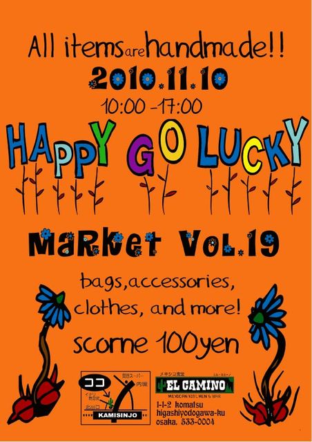 Happy☆Go☆Lucky MARKET 11月10日 水曜日 10:00 〜 17:00 19回目のMARKET 今回も定番の商品〜新作までいろいろ用意してますよ ハンドメイドの雑貨や服、人気のスコーンなど 見てるだけでも楽しんでいただけると思います。 ぜひお友達を誘って遊びに来て下さいね。 場所: EL CAMINO 旧BAR EROS 住所 : 東淀川区小松1-1-2 (上新庄) 上新庄北口近くの稲荷商店街入り口(内環状線側)です。 TEL: 06-6328-7933