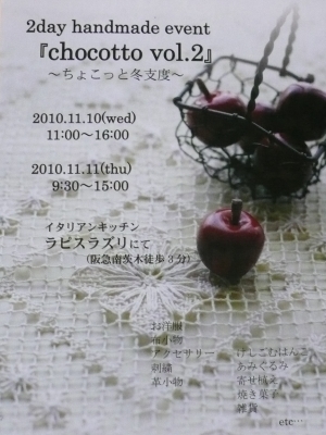 管理人様 はじめまして。 貴重なスペースをお借りします 11月10日(水)11日(木)の2日間、 南茨木にある『ラピスラズリ』さんにて ハンドメイドと雑貨の2day Shopを開催します♪ 『chocotto vol.2』 〜ちょこっと冬支度〜 2010.11.10(wed)11:00-16:00 11(thu) 9:30-15:00 南茨木『イタリアンキッチン ラピスラズリ』にて (阪急京都線南茨木 徒歩3分) お洋服 布小物 アクセサリー クレイアート