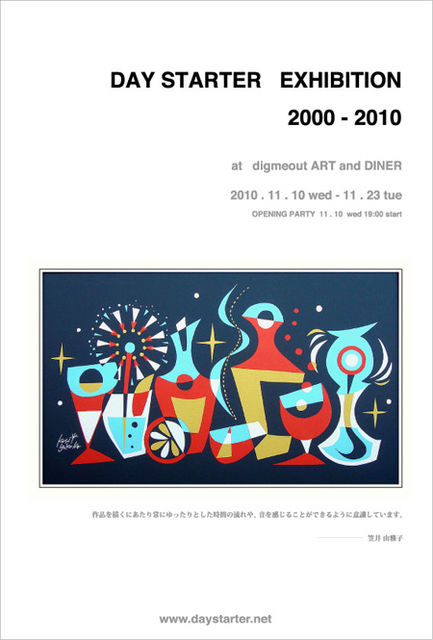 DAY STARTER EXHIBITION 2000 - 2010 2010 . 11 . 10 (水) - 11 . 23 (火) OPENING PARTY 11 . 10 (水) 19:00 start at digmeout ART and DINER http://www.digmeout.net/diner/ 2000年より笠井 由雅子がDay Starter として活動をスタートして、今年で10年が経ちました。 その節目にディグミーアウトにて、これまでの作品とクライアントワークの一部を 展示いたします。 出展作品の一部は期間中販売もいたします。 是非みなさん遊びにきてくださいね。