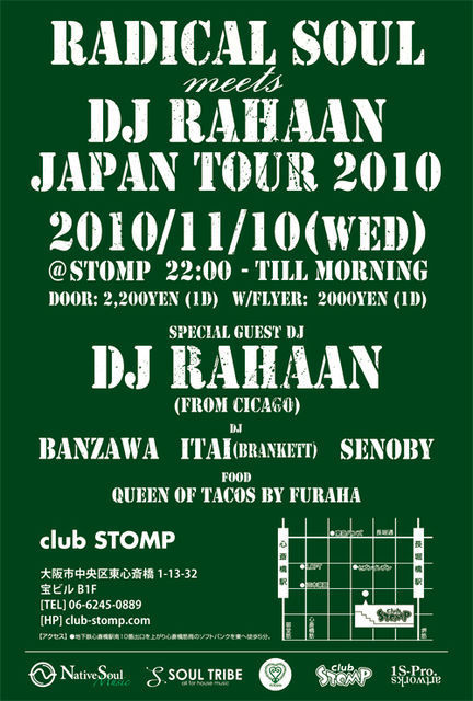 管理人様、告知失礼いたします。 2008年5月のbrankett以来、約2年半ぶりにDJ Rahaanが大阪に現れます! あの荒々しくも拳が上がるプレイはSTOMPの雰囲気ともバッチリはまるはず! この機会をお見逃しなく! ------------------------------------------------ 【Radical Soul meets Rahaan Japan Tour 2010】 2010.11.10(WED) at STOMP 22:00〜TILL MORNING 料金:DOOR 2,200(1D) *WITH FLYER 2,000(1D) [SPECIAL GUEST DJ] Rahaan [DJ] BANZAWA ITAI(brankett) SENOBY [Food] Queen of tacos by fura
