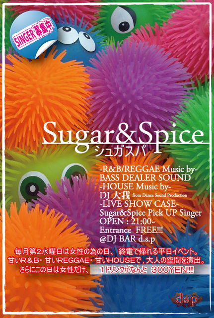 ☆ SUGAR & SPICE -内容- 毎月第2水曜日にBASS DEALER SOUND & DJ BAR d.s.pが企画する女性の為のWeekday Party 甘いREGGAE 甘いR&B 甘いHOUSE Only Playで大人の女性が集う空間を演出。 仕事帰りに誰もがふらっと立ち寄れる入場無料イベント。さらに女性は、1drink \300というプライスにてご提供させて頂いております。 今回も勿論、入場無料イベント。さらに女性は、1drink \300というプライスにてご提供させて頂きます(通常価格500円→300円、600円→400円となります) ■2010.11/10(水) ■Sugar&Spice シュガー&スパイス http://