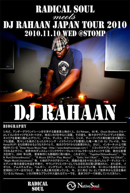 管理人様、告知失礼いたします。 不適切でしたらお手数ですが削除お願いいたします。 11/10(水)、シカゴ、アンダーグラウンドシーンを引率する最重要人物の一人、DJ Rahaanが来阪します!!この機会をお見逃しなく!! mixi見たでディスカウント価格で入れます! ------------------------------------------------ 【Radical Soul meets Rahaan Japan Tour 2010】 2010.11.10(WED) at STOMP 22:00〜TILL MORNING 料金:DOOR 2,200(1D) *WITH FLYER 2,000(1D) [SPECIAL GUEST DJ] Rahaan [DJ] BANZAWA