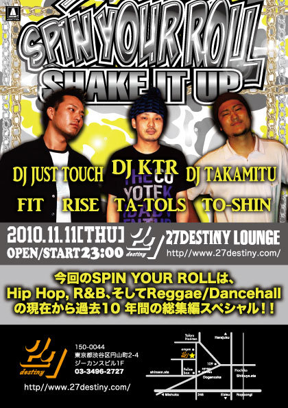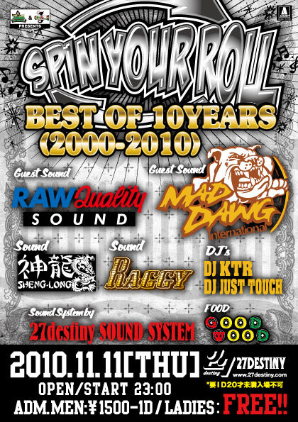 今回のSPIN YOUR ROLLはBEST OF 10 YEARS〜2000-2010〜と題し、MAD DAWGとRAW QUALITYの2SOUNDsを招いて、一晩でDANCEHALL REGGAEの10年間を振り返る内容となっています。懐かしのあの曲や、今、流行の鉄板TUNEなどなど、、、
