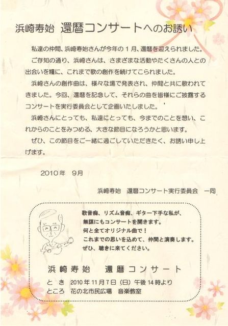 管理人さん、スペースお借りします。 明日、11月7日 作曲家・浜崎寿始さんの「還暦コンサート」があります。 すべて、オリジナルです。 じろりんもゲストで、歌うので、お近くの方はどうぞ・・・・・ 場所は、「花の北市民広場・音楽教室」午後2時からです。