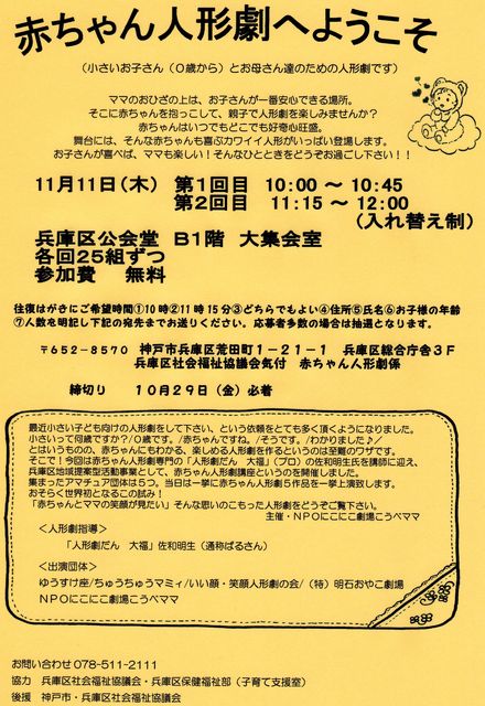 世界初の試み 「赤ちゃん人形劇」の大集合です 「赤ちゃんって人形劇をどれぐらい楽しめるんだろう」 と、本気で考え、脳科学的に分析し、実践(子育て)で学び、臨床(子どもに見せて)を重ねた劇団が5つ。 一挙公開です もちろん、3歳のお兄ちゃんも夢中にさせ、ママを飽きさせることもありません どうぞご期待下さい お申込みはコチラへ 11月11日(木) 第1回目 10:00 〜 10:45 第2回目 11:15 〜 12:00 (入れ替え制) 場所・兵庫区公会堂 B1階