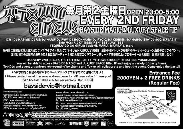 横浜最大級のクラブベイサイド横浜にて11月12日(第二金曜日)、Y-TOWN CIRCUSが開催!! 最新のHIP HOPから往年のパーティーチューン満載のビッグイベント。