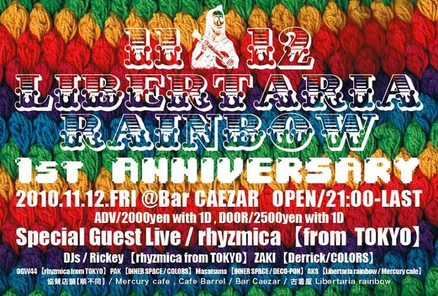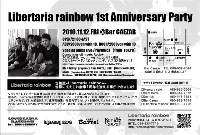- Libertaria rainbow 1st Anniversary Party - 2010.11.12 (FRI) @Bar Caezar OPEN - LAST 21:00 - 2:00 TICKET ADV/DOOR 2000/2500yen w.1DRINK Special Guest Live rhyzmica (from...TOKYO) DJ's Rickey (rhyzmica from...TOKYO) OGW44 (rhyzmica from...TOKYO) ZAKI (Derrick) Masatsuna (INNER SPACE) PAK (INNER SPACE) AKS (Libertaria rainbow,Mercury cafe) Bar Caezar...089-932-7644 愛媛県松山市三番町2-8-2 豊島ビル3F ※お問い合わせ・TICKET予約 mail ; barcaezar@gmail.com (イベント名, 予約代表者様