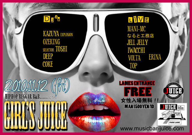 今回で5回目の開催となるjuice人気イベント「Girl'sJuice」!地元を中心に精力的に活動しているアーティストを集め、最新のhiphopからR&B.REGGAE.HOUSE.90s'まで幅広い音楽を楽しめるpartyです♪