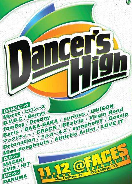 「Dancer's High!!」 -DanceShow/HIPHOP/R&B- 11/12(fri)@Faces OPEN-21:00 Mail \1,500(2T) 受付でこちらの画面をご提示下さい ATD \1,500(1T) ◆Dance Showcase◆ Meeet / ピロシーズ/ Gossip D.V.B.C / Destiny Barts / curious UNISON / マックリティー / CRACK BEatrip / Virgin Road Detonation / ミルガールズ symphoNY / Miss doughnuts Athletic Artist / LOVE IT -順不同- ◆DJ◆ MASAKI/EVIS/HIT ◆MC◆ DARUMA