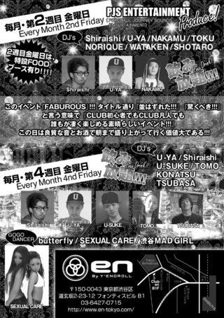 管理人様告知失礼します!!! 迷惑でしたら消去もしくはメッセージ頂けたらありがたいです!!! やってまいりました!!!(金曜)渋谷CLUB『エン』(元CLUB『PURE』もしくは『Xanadu』)にて (集客人数350〜400人ぐらい入るCLUBです!!!広いです!!!) 飲み放題さらに出入り自由のイベント!!! しかもしかもメッセージ頂ければな〜んと!! LADIES \2000円 MENS \3000円 もしくわ ショータロのゲストでショータロと言って頂いても同じくゲスト金額になりま