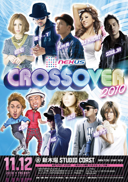 タイトル:NEXUS CROSSOVER 2010 日程:2010年11月12日(fri) 会場:新木場STUDIO COAST OPEN/START 17:30/18:30 出演:九州男/童子-T/BENI/MAY'S/AZU/DJ KAORI/KG/SoulJa/C&K チケット:\3,500(税込) プレイガイド:SOGO TOKYOオンラインチケット チケットぴあ0570-02-9999(Pコード:119-303) ローソンチケット0570-084-003(Lコード:75226) イープラス CNプレイガイド NEXUS WEB お問い合わせ:SOGO TOKYO 03-3405-9999 主催/企画/制作:NEXUS実行委員会