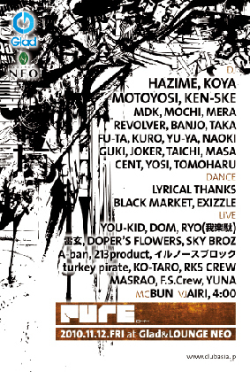管理人様、告知失礼致します。 今週末! 渋谷Glad, Lounge NEO二店舗連動にて 第二金曜おなじみのビッグイベント"PURE" 一度入ってもらえればGlad, Lounge NEOとも無料で行き来できます 出演者陣ももちろん豪華! 2階のGladのGUEST DJにはなんと"DJ HAZIME" GUEST DANCEもLYRICAL THANKSにBLACK MARKET, EXIZZLEと 有名チームの競演で目が離せません 5階Lounge NEOにもDJ KOYA, MOTOYOSI, KEN-SKEと こちらも豪華なメンツでハイクオリティなフロアを演出してくれるでしょう
