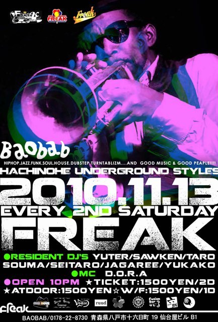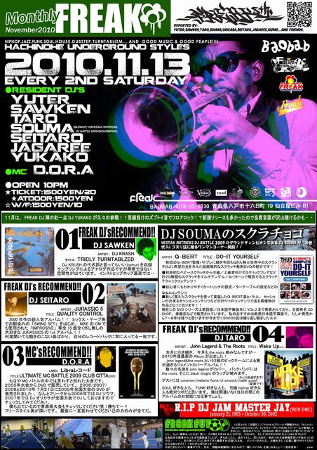★★★★★★★★★★★★★★ 今月のFREAKは、当イベントの紅一点DJのYUKAKOが、久々のスピン!男勝りのplayに注目!そしていつものDJ陣。 FUNK、JAZZ、SOULを多彩に織混ぜ独自のHIPHOP BREAKを繰出すYUTER、TARO! 様々なジャンルをCROSSOVERさせるSAWKEN! 様々なMUSICをターンテーブリズム化する、2009年スクラッチチャンピオンのDJ SOUMA! BREAKBEATSを駆使したダンサブルMUSICのSEITARO! 老若男女問わず対応可能なALL GOOD MUSICのJAGAREE! このメンツにMICで割り込みFREESTYLEをかますD.O.R.A! 今宵もこのメンバーと共に